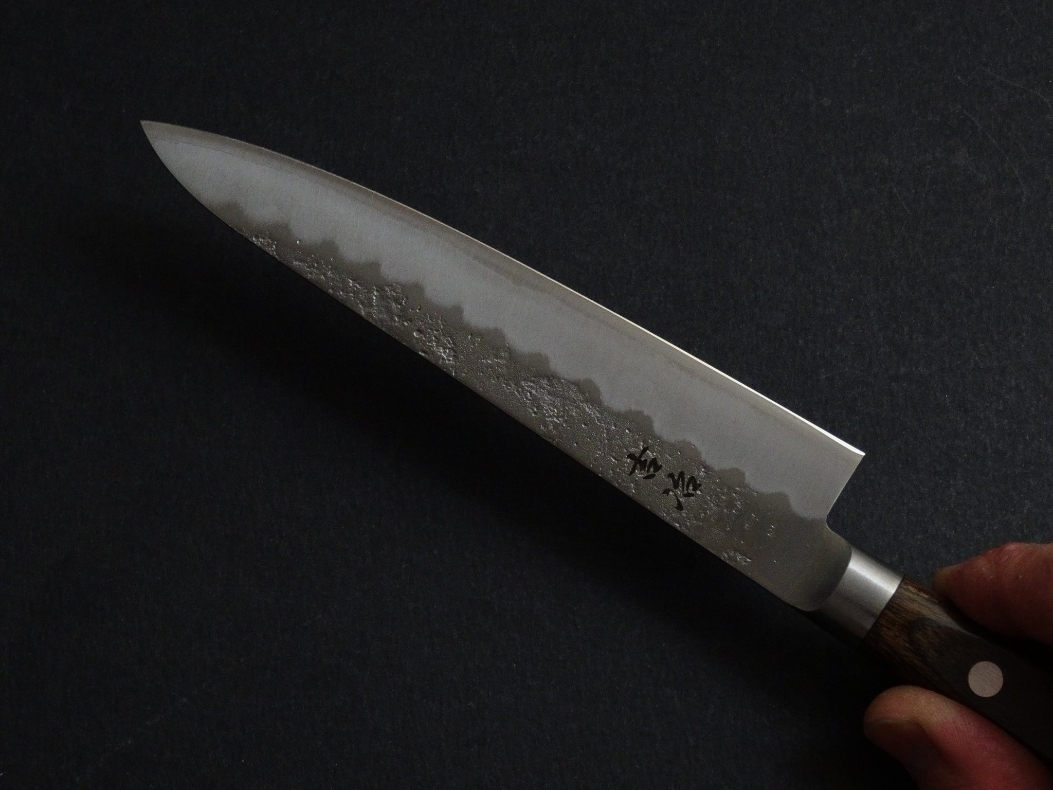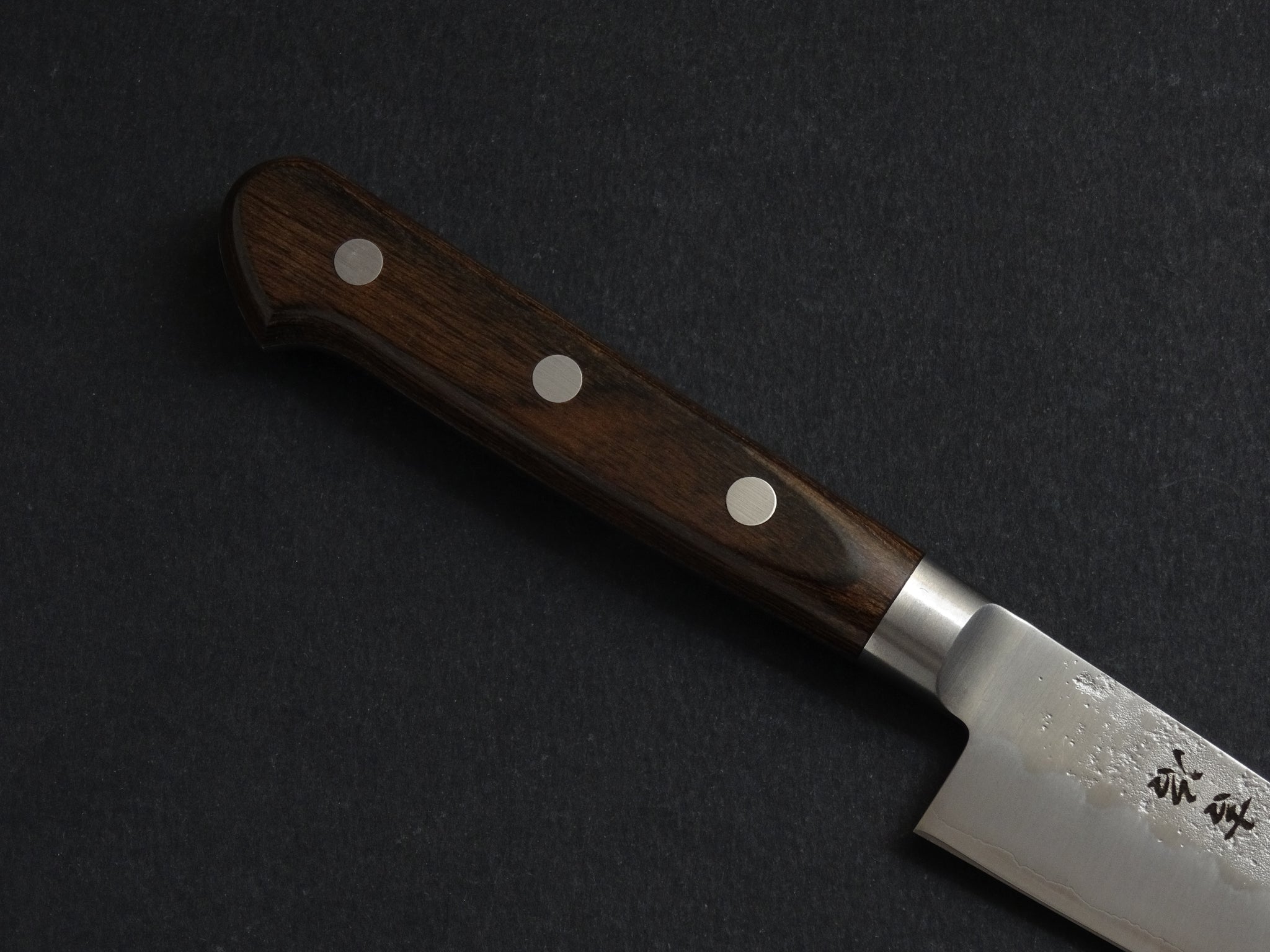 The rustic Nashiji finish on the blade contrasts nicely with the durable Pakka wood handle scales. The san-mai construction and stepped grind makes this line easy to thin or sharpen wide bevel style. Ginsanko is Hitatchi’s primary stainless steel and a popular choice with Japanese bladesmiths, as it is not heavily alloyed it is considerably easier to sharpen than most fully stainless steel commonly used.