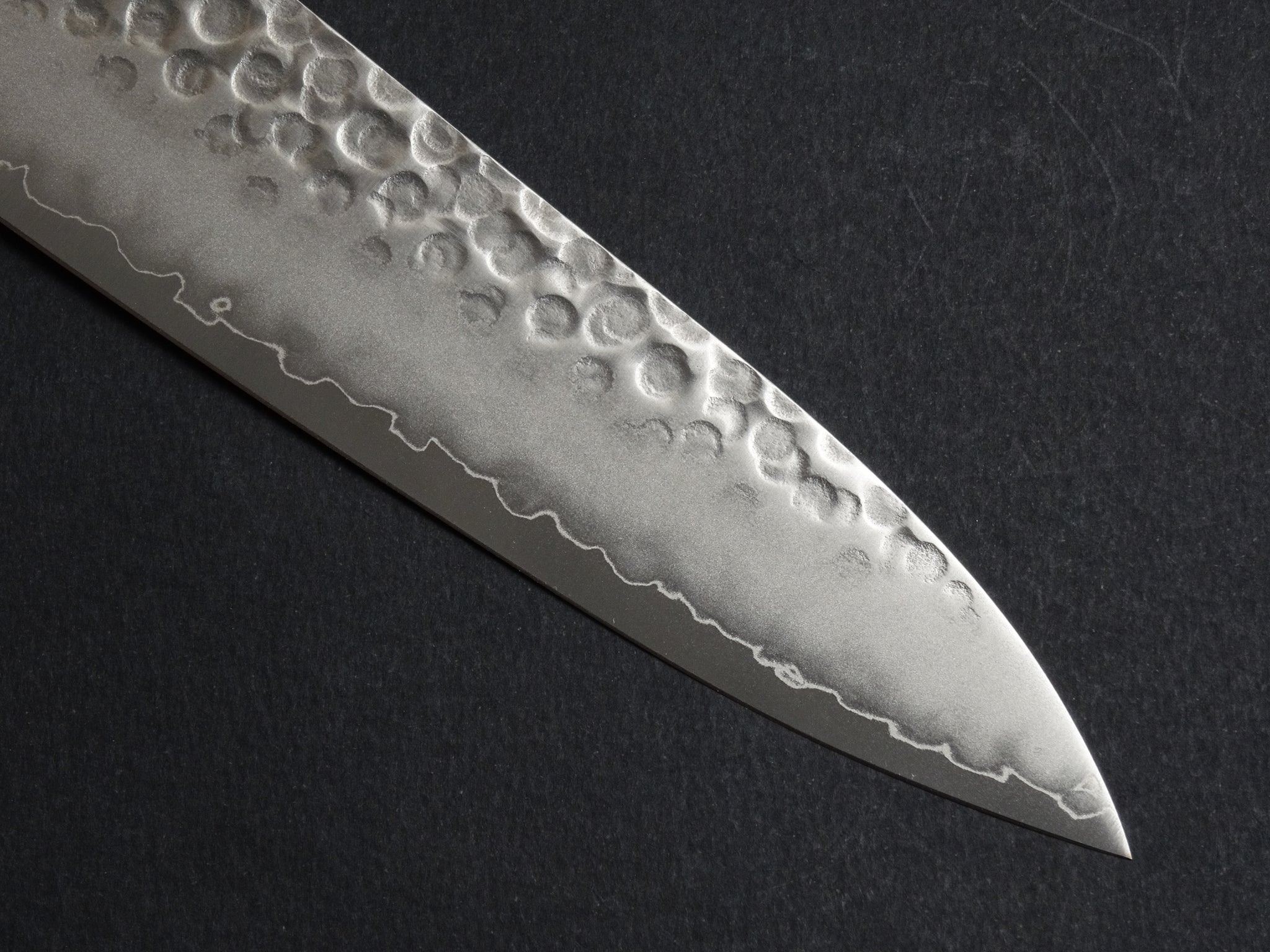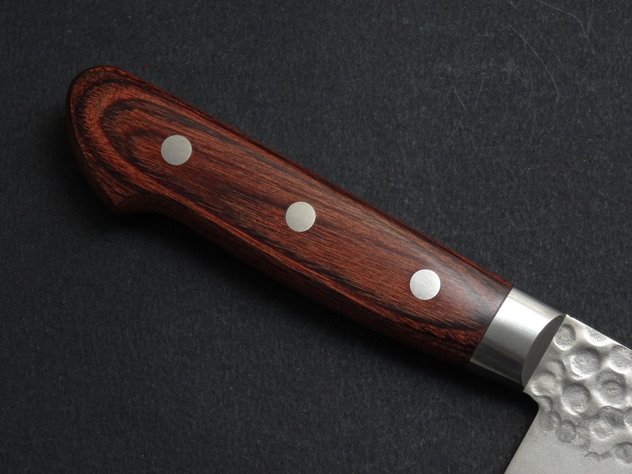 The blade has a stepped grind and Tsuchime finish helping it to move effortlessly through food whilst reducing food sticking. The balance on this series is closer to western style cutlery due to the western handle and stainless bolster.