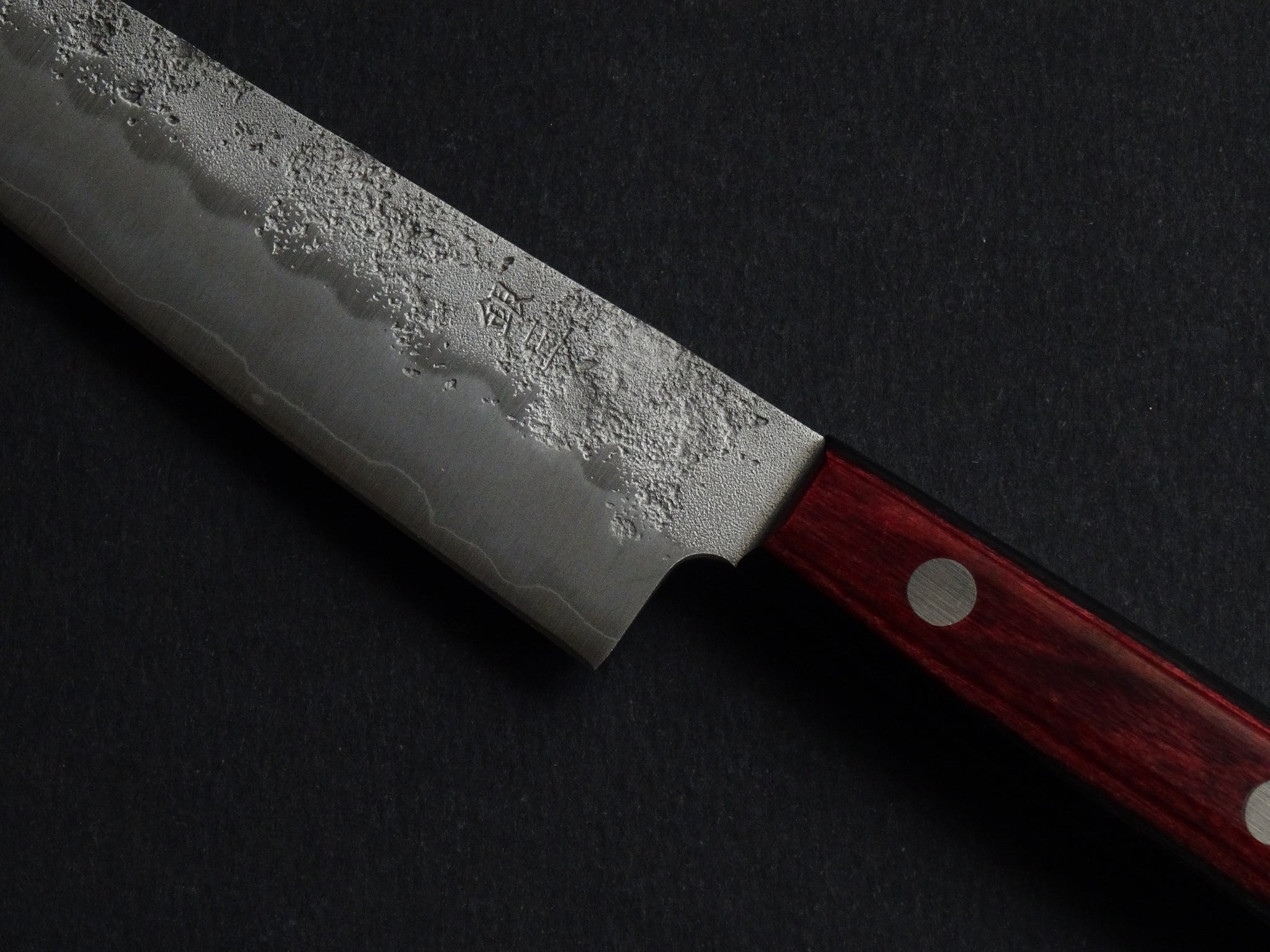 The rustic Nashiji finish on the blade contrasts nicely with the durable Pakka wood handle scales. The san-mai construction and stepped grind makes this line easy to thin or sharpen wide bevel style. Ginsanko is Hitatchi’s primary stainless steel and a popular choice with Japanese bladesmiths, as it is not heavily alloyed it is considerably easier to sharpen than most fully stainless steel commonly used.