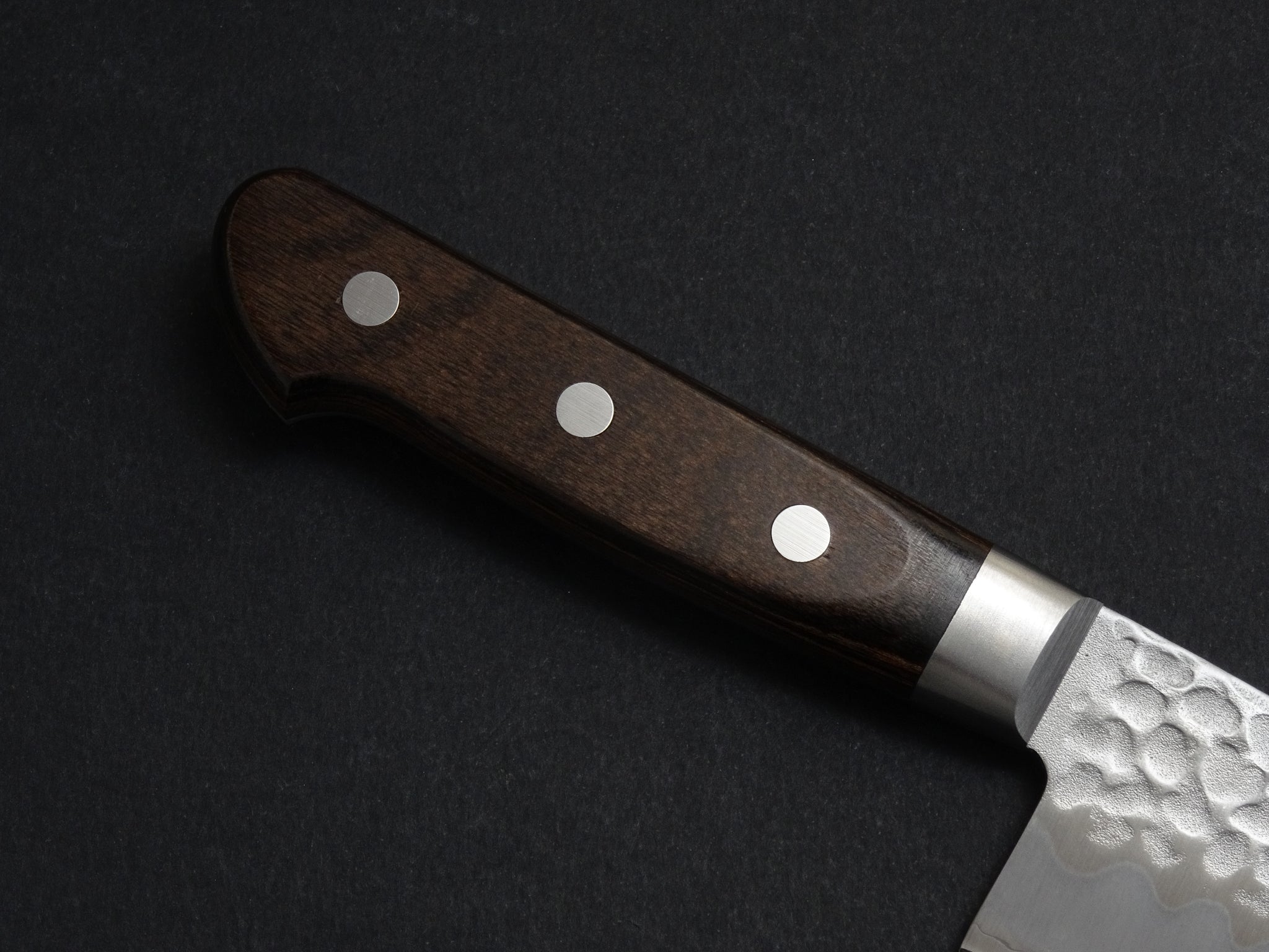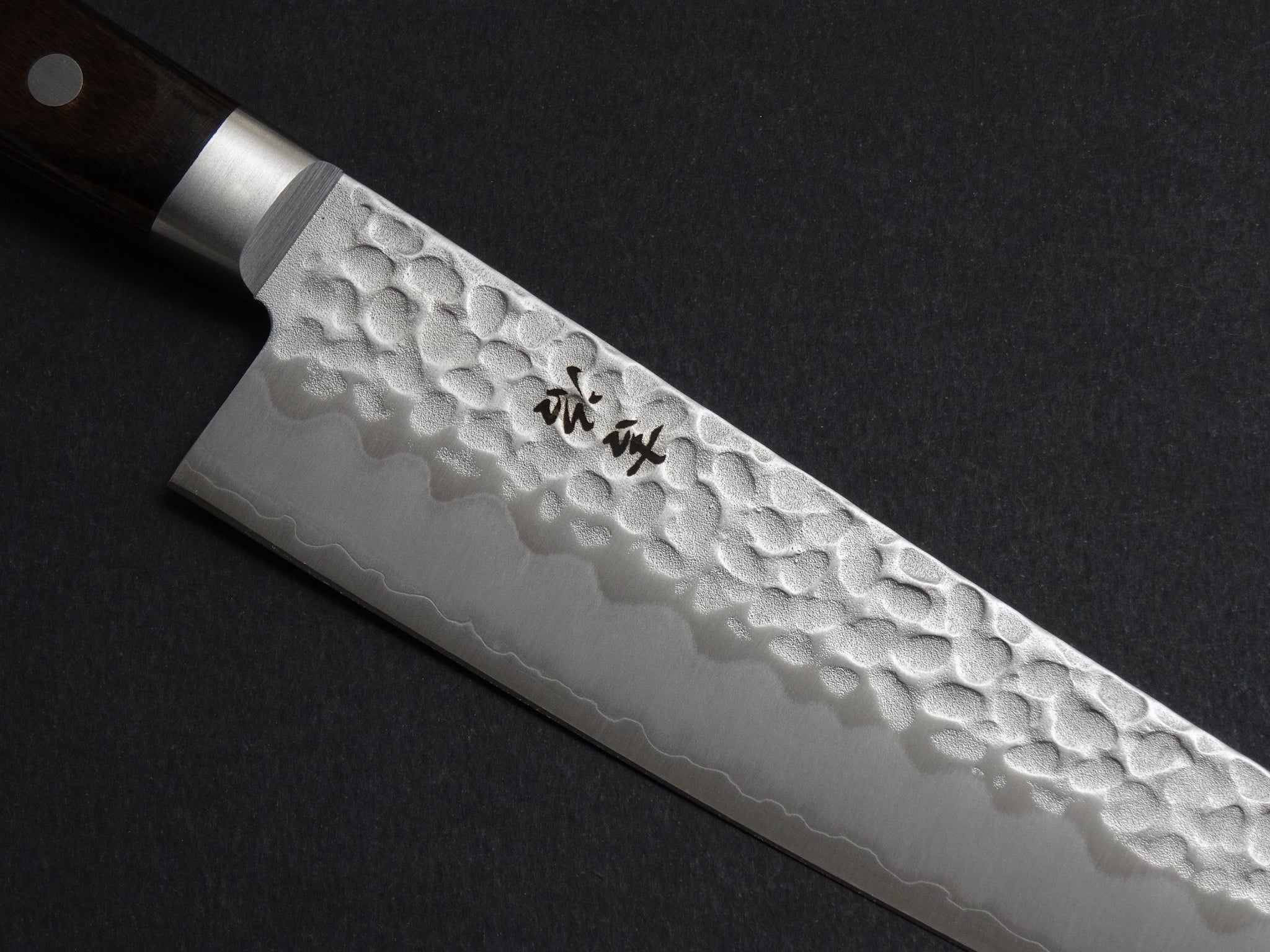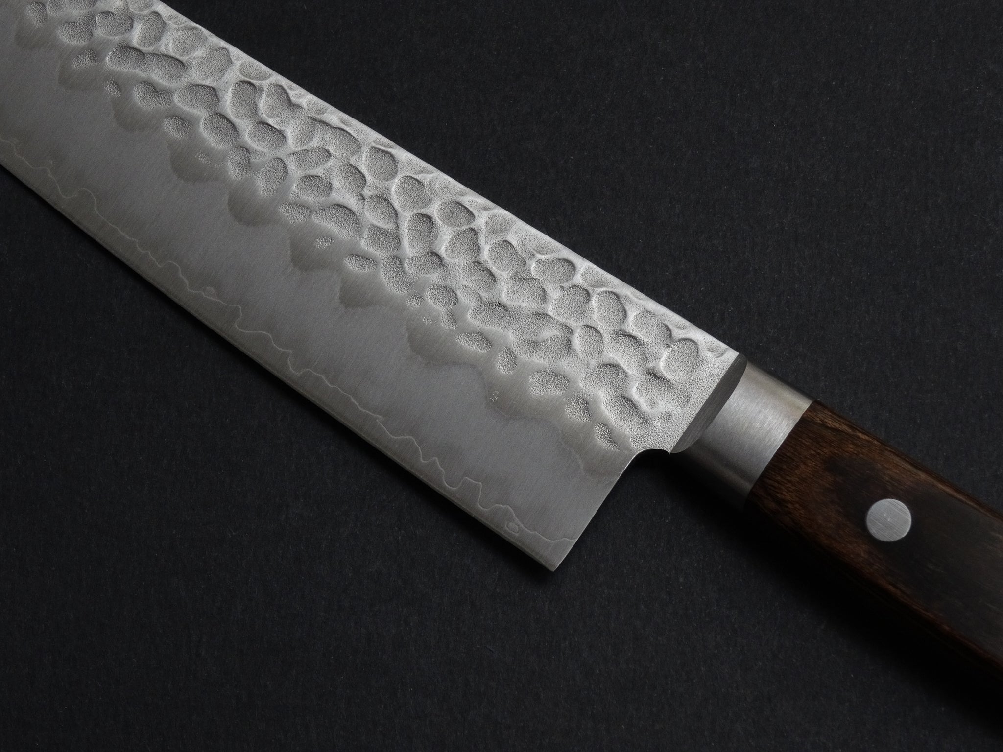 Drop forged in Tosa, Kochi prefecture using Aichi Aus-8 steel With an HRC of 57-59. This workhorse series have a stepped grind and tsuchime finish with a full tang and western handle made from pakka wood. This series is particularly popular with professionals as it is tough and easy to maintain.