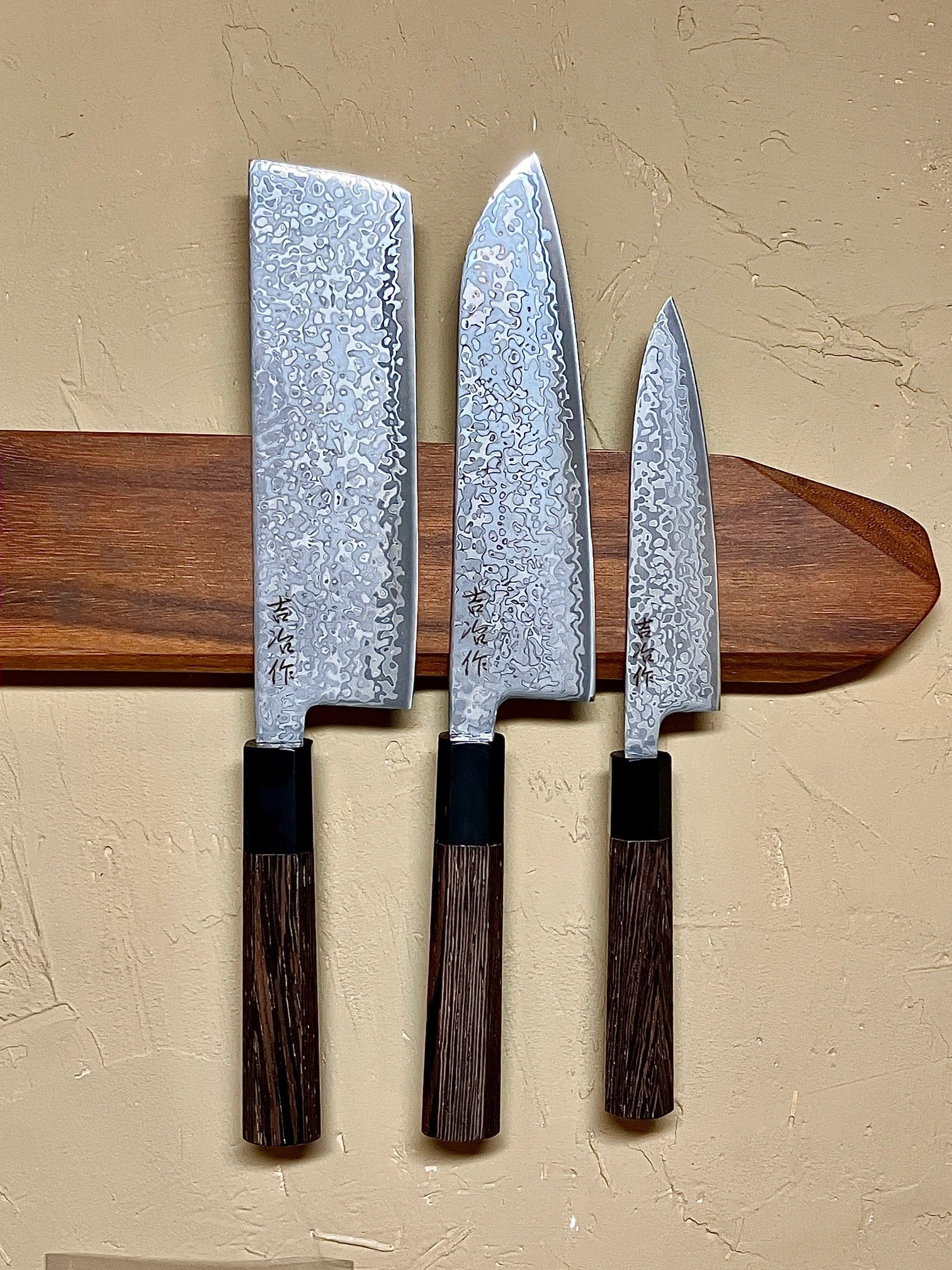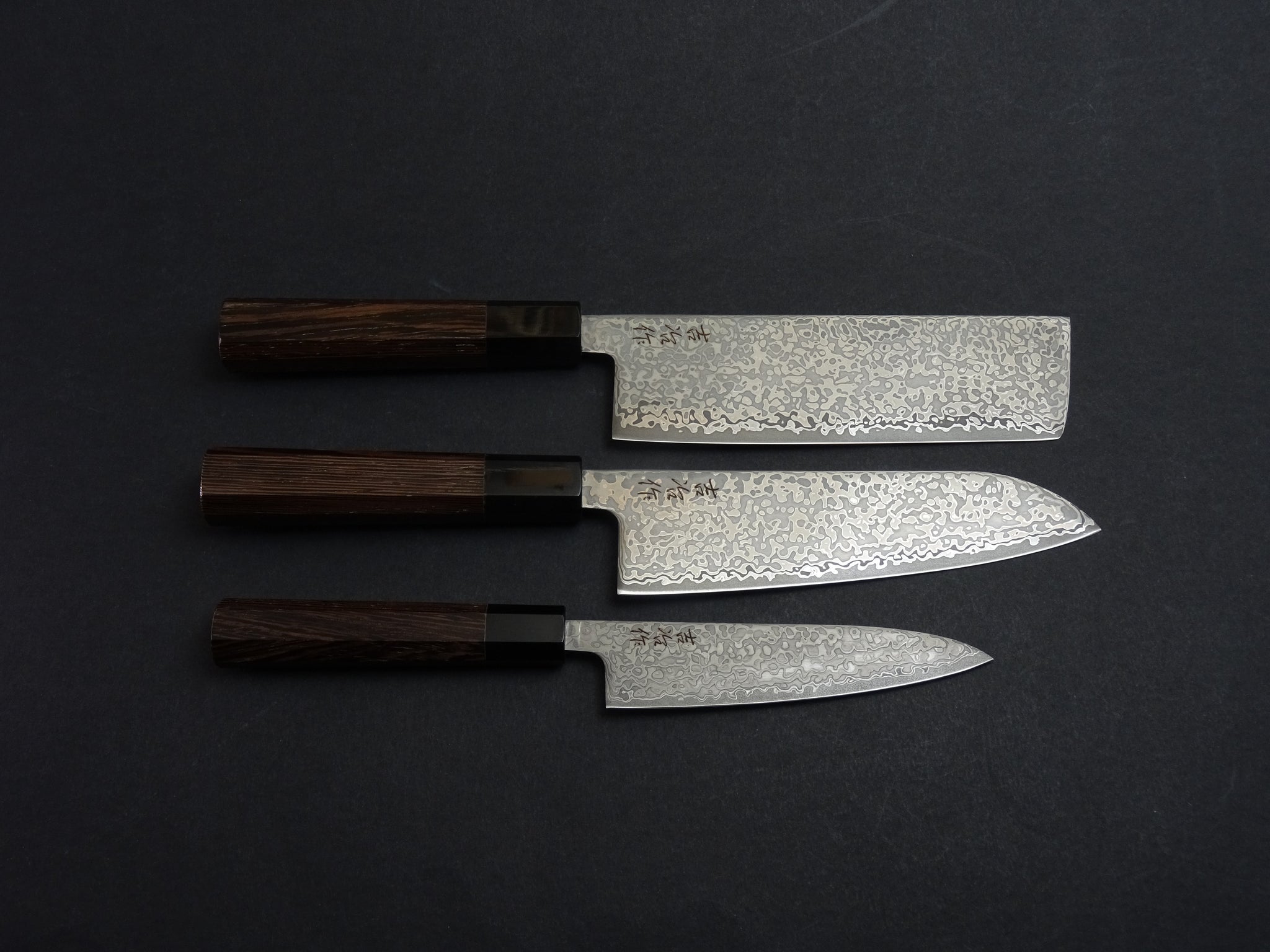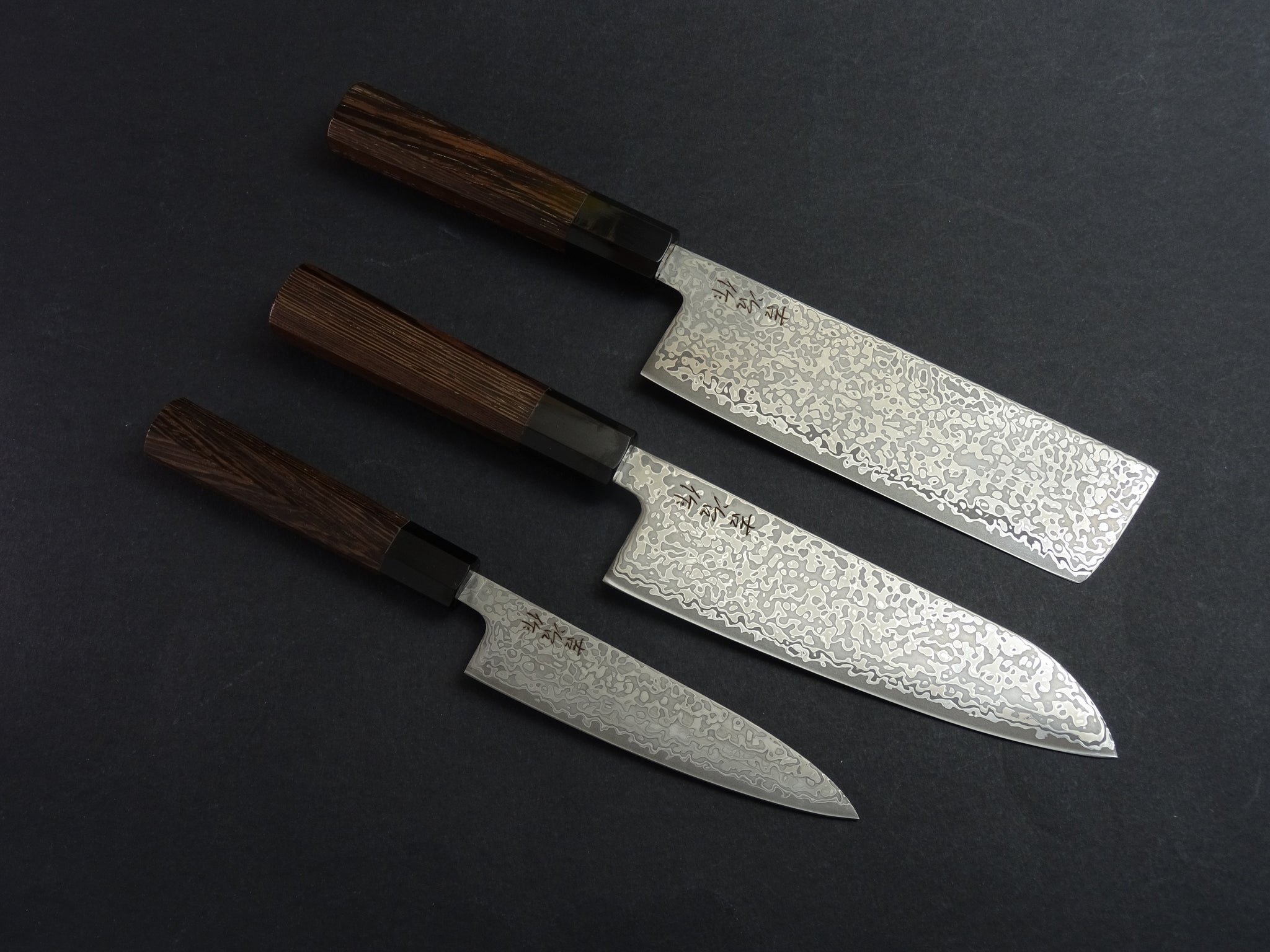 SET OF 3, KICHIJI HIKARI SLD STAINLESS CLAD DAMASCUS KUROZOME OCTAGONAL WENGE HANDLE